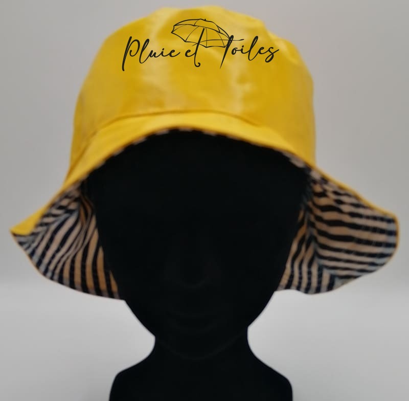 Bob pour la pluie en ciré marin jaune réemployé, doublé en coton rayé bleu foncé et blanc. Fabriqué en Bretagne, artisanalement. Taille M