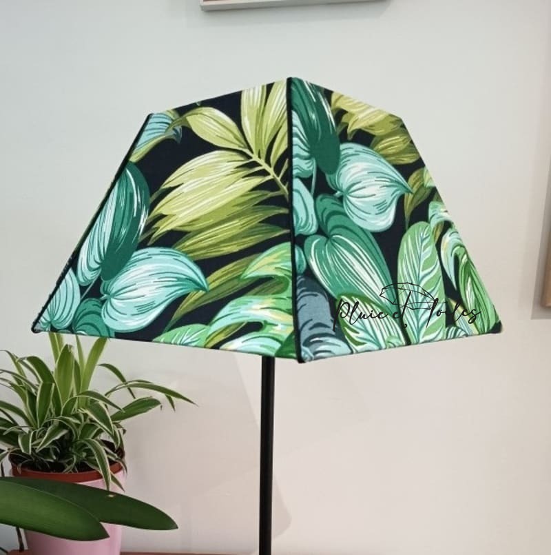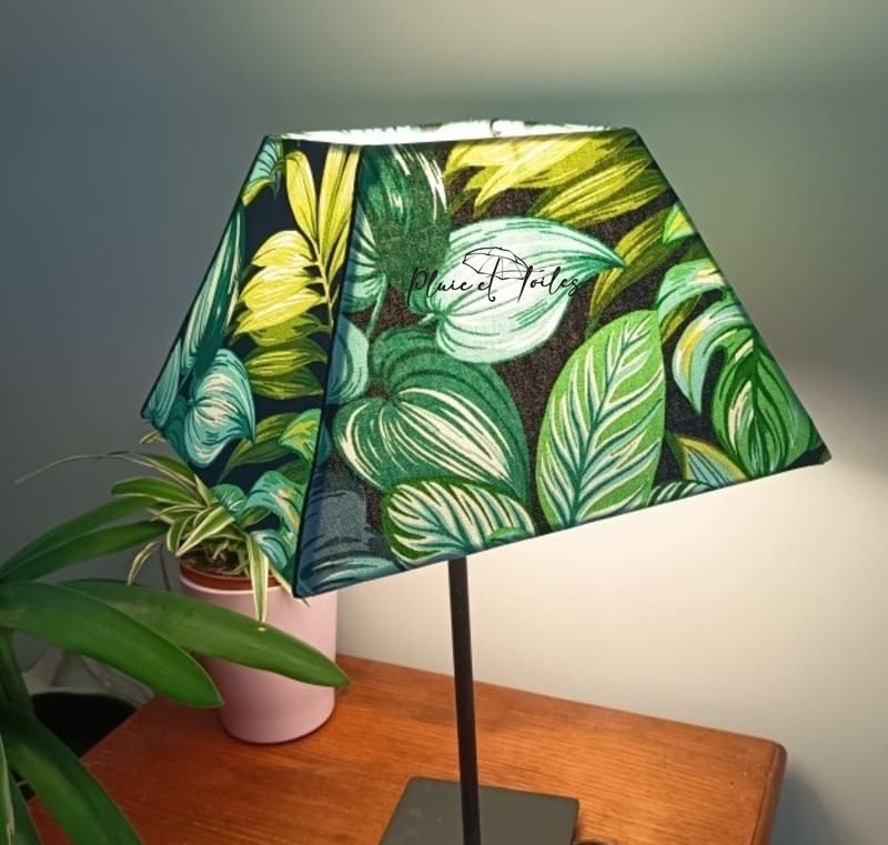 Cet abat-jour grande pyramide est recouvert d’un beau tissu de seconde main. Il est couvert de grandes fleurs vertes et bleues qui lui donne une belle élégance. Vous pourrez le poser sur un meuble ou sur un grand pied pour habiller votre salon. Vous utiliserez une ampoule E27 pour cet abat-jour de 30 cm de large à sa base et de 19 cm de haut.