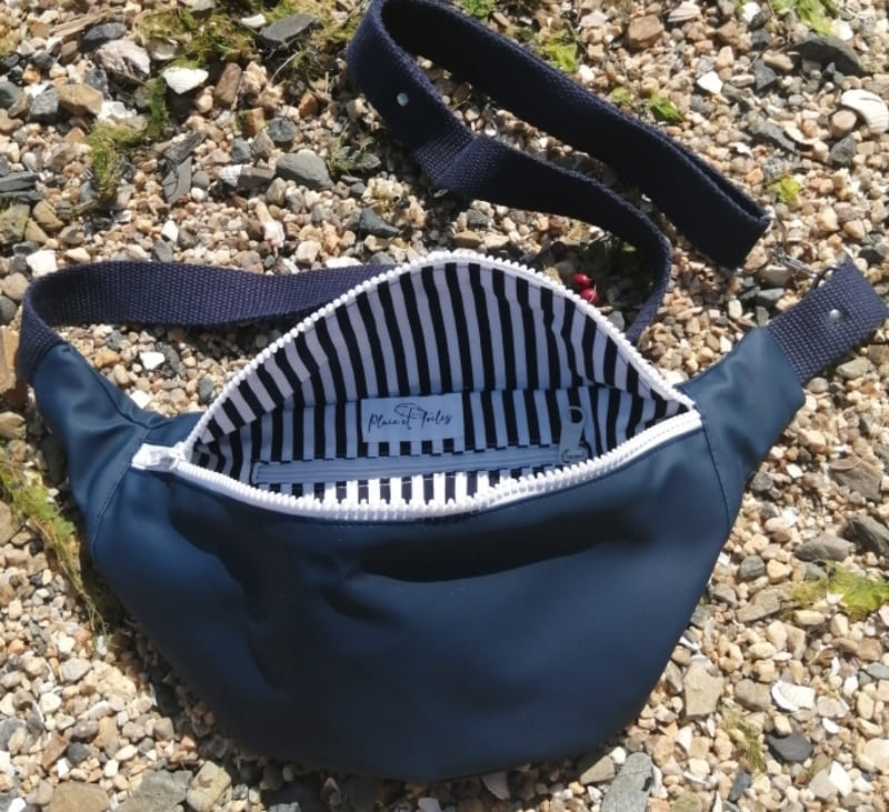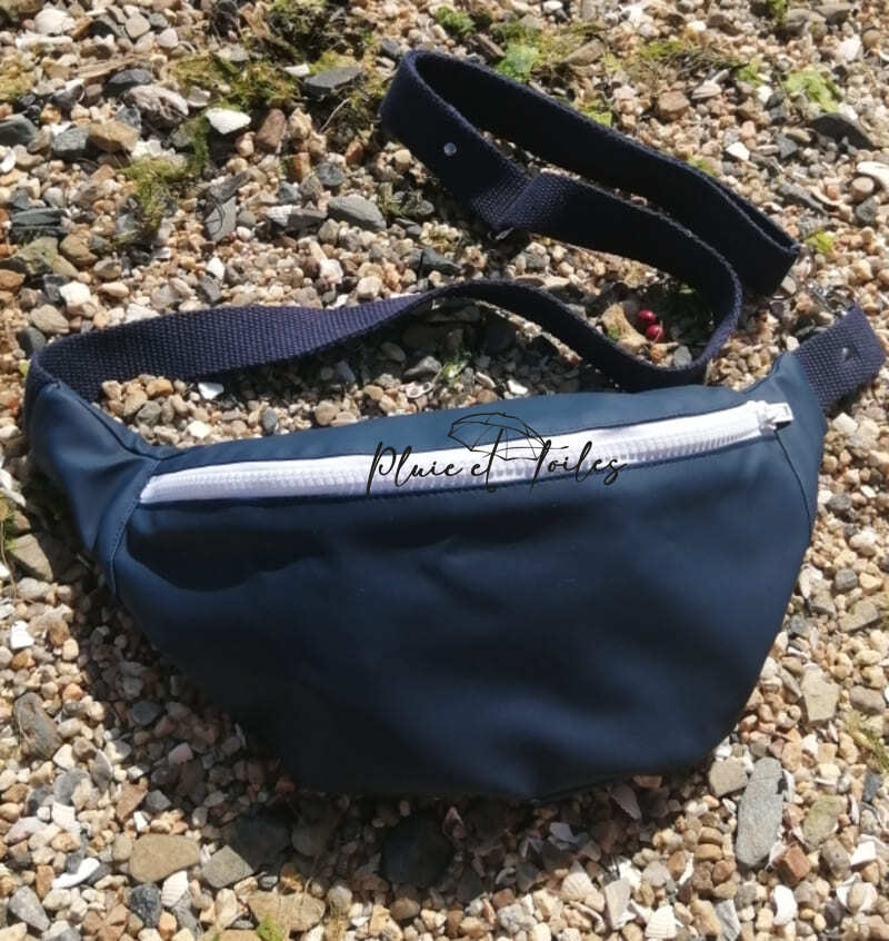 Le sac banane réalisé en ciré marin bleu marine, fermé avec un zip blanc, est symbolique de la Bretagne mais revisité en bleu pour plus d’originalité.