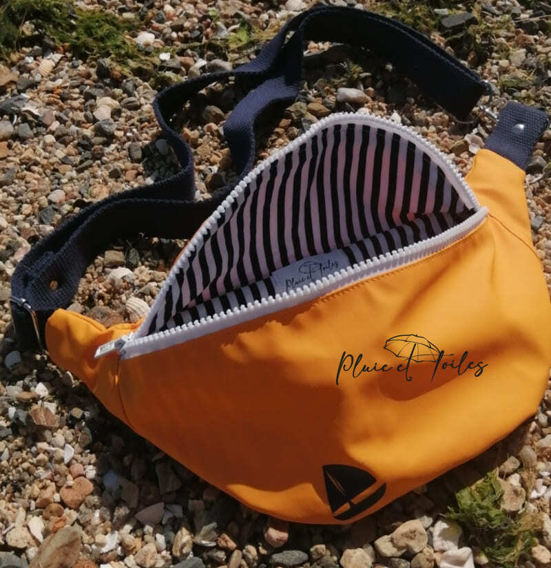 Le sac banane réalisé en ciré marin jaune, fermé avec un zip blanc, est symbolique de la Bretagne par le rappel au ciré et aux bottes que l’on met pour aller sur la plage ramasser des coquillages! Sa matière lui permet de garder vos affaires au sec. Sa taille est celle d’un sac banane classique. Vous pouvez y mettre votre téléphone, vos papiers, votre porte monnaie, des mouchoirs..