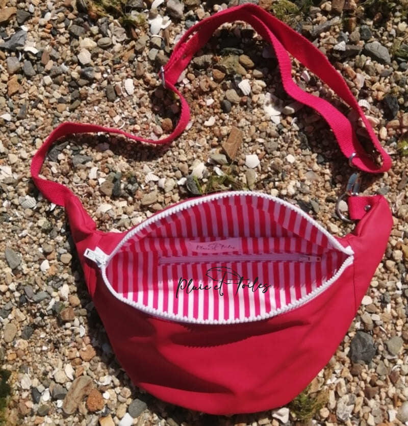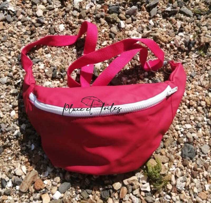 Le sac banane réalisé en ciré marin rouge, fermé avec un zip blanc, est symbolique de la Bretagne mais revisité en rouge pour plus d’originalité.
